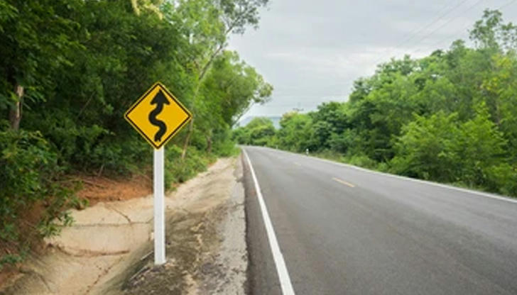 When you see a yellow diamond with a curving arrow, what hazard is it alerting you to?